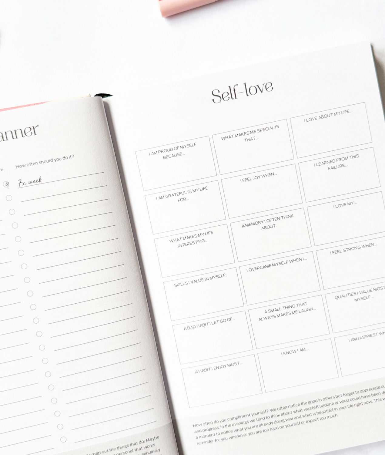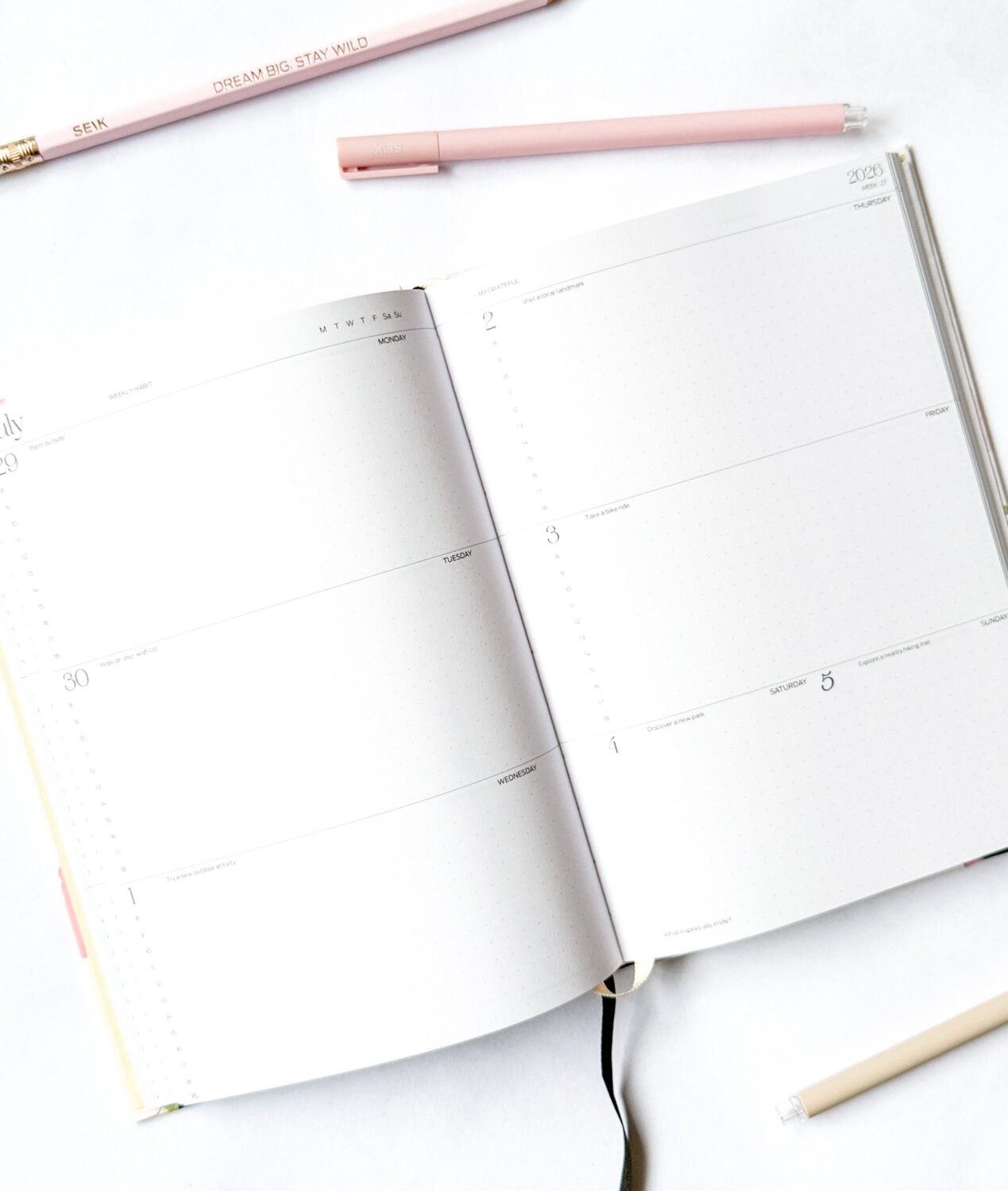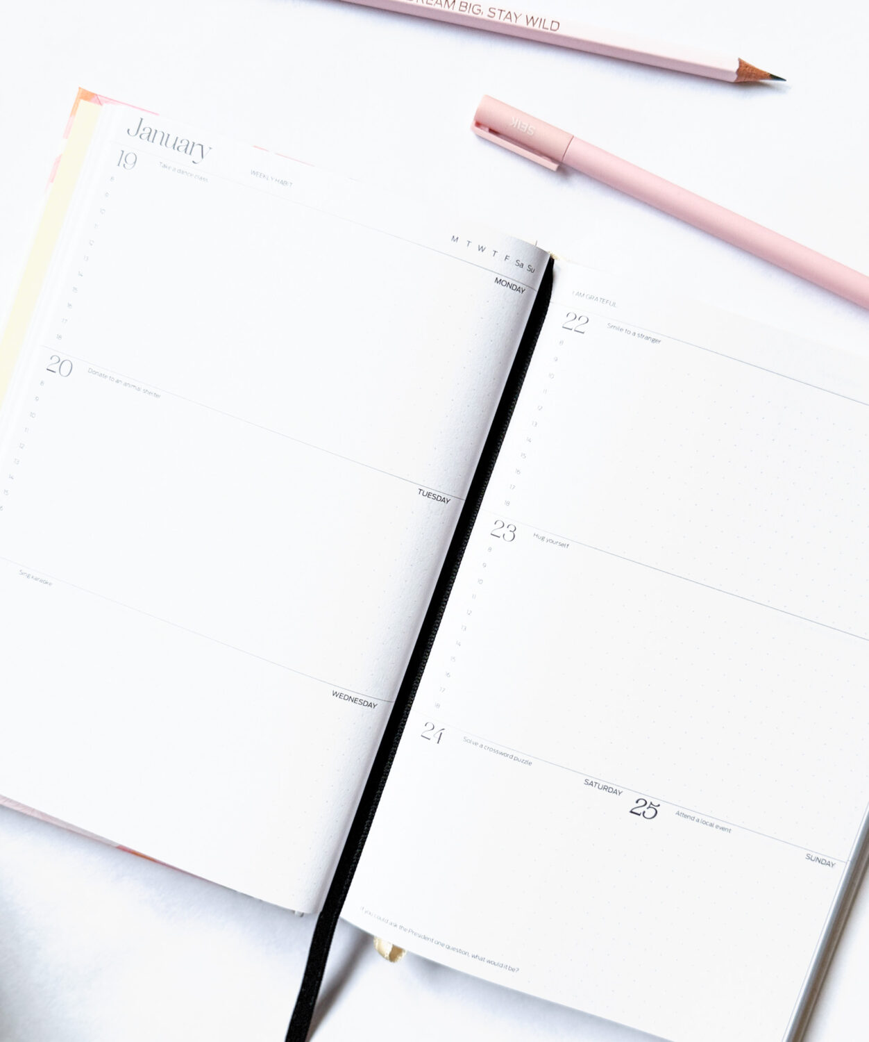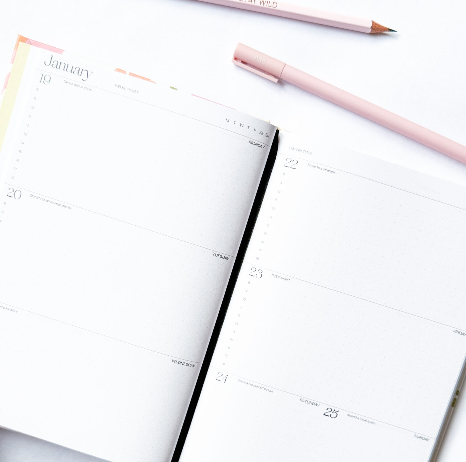 Dobré návyky formujú dobrý život. Na tejto stránke môžete objavovať a sledovať rutiny, ktoré podporujú vašu pohodu. Nájdete tu nápady, ktoré sa starajú o telo aj myseľ a pripomínajú, že produktivita a rovnováha idú ruka v ruke. Každý týždeň si môžete zapísať nový návyk na týždennú stranu, ktorá vám ho bude pripomínať každý deň.