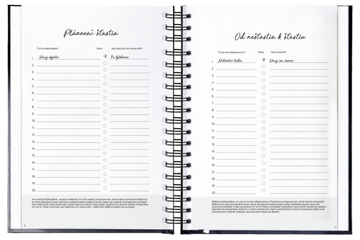 Naplánujte si školský rok pomocou plánovača Happy Calendar s denným kalendárom aktivít. Snívajte vo veľkom a stanovte si ciele. Diár má dostatok miesta na zapisovanie týždenných úloh. Na konci roka nájdete retrospektívne stránky na analýzu vášho úspechu. Naším cieľom je urobiť vás šťastnejšími. Vyskúšali sme rôzne metódy a zistili sme, že ľudia sú šťastnejší, keď sa sústredia na správne veci a vidia v každom dni to dobré.